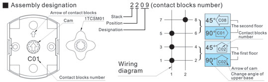 •Put cam to 1TCSM01,set the arrow of the contact blocks pointing "up", rotate cam and make cam's arrow pointing to the required direction. (see wiring diagram) | ||||||||||||||||||||||||||||||